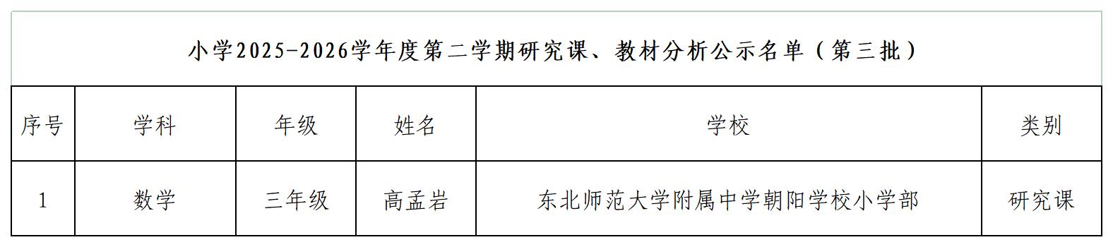 小学2025-2026学年度第二学期研究课、教材分析公示名单(第三批)数学
